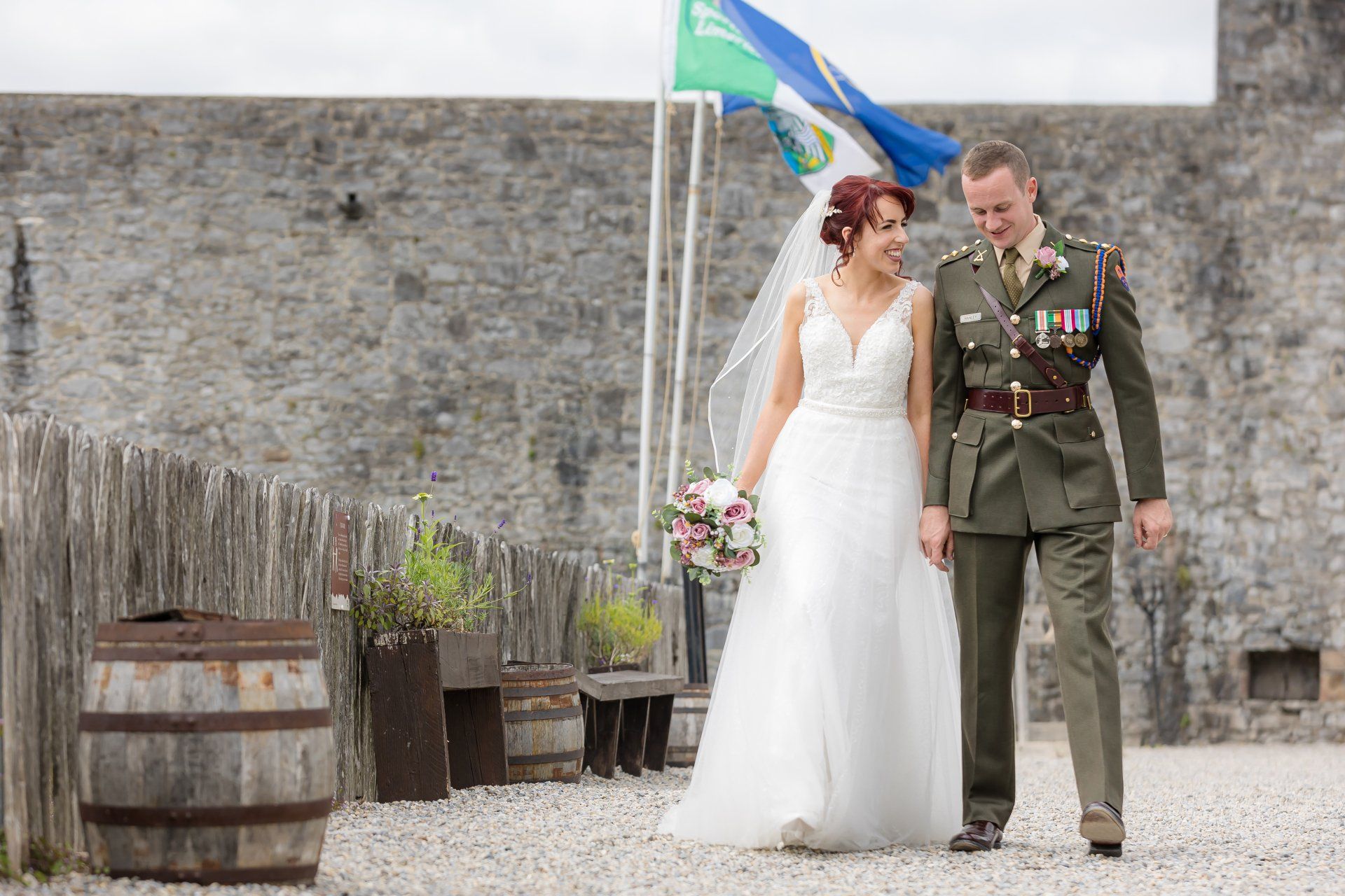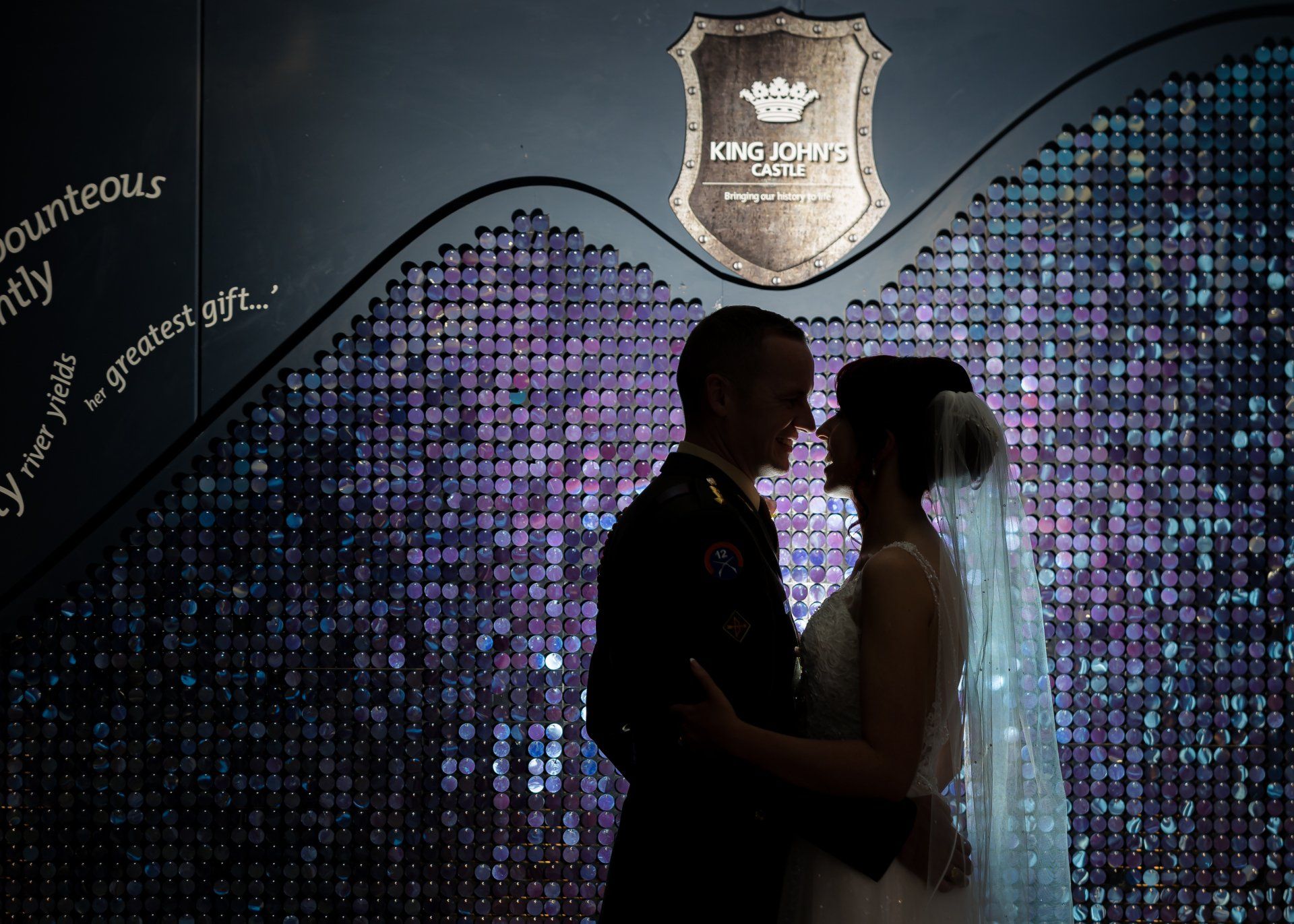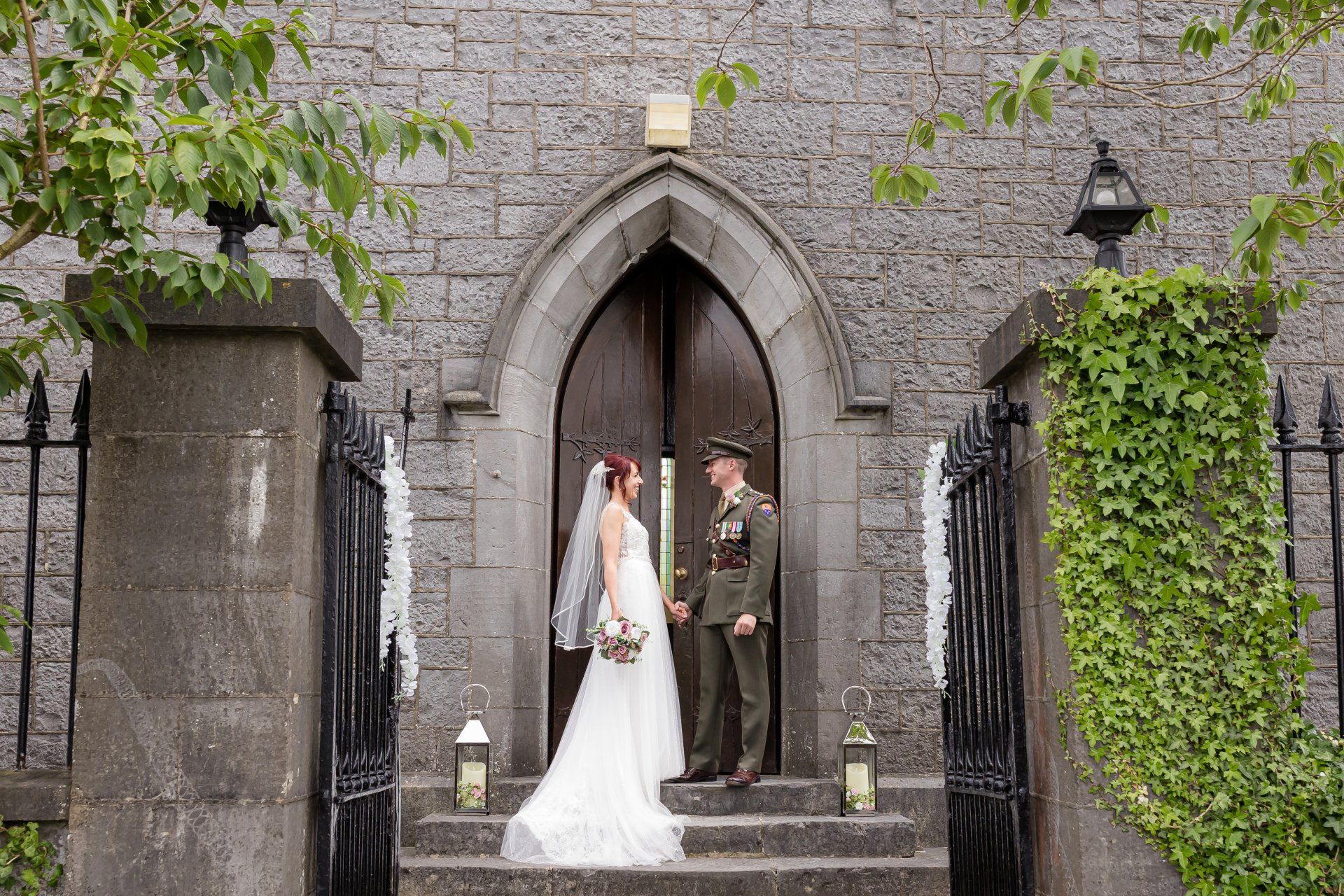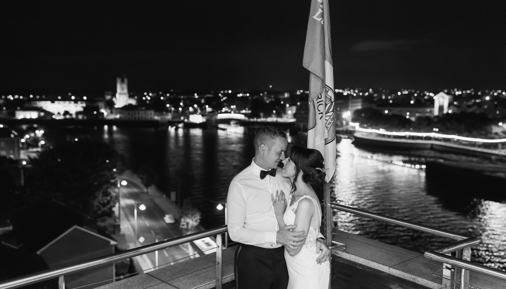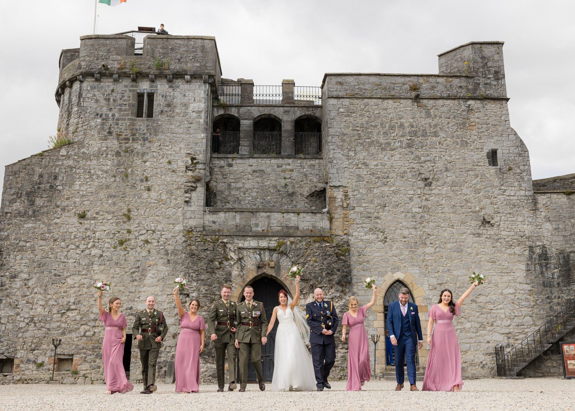 In front of 130 family and friends, Tina walked up the aisle of Sarsfield Barracks, in a stunning ivory crepe dress, purchased from Maeve in the Bridal Emporium, Miltown Malbay. It was decorated with lace and sequins on the bodice and lace donned the train, complimented with a butterfly back. Tina’s two-layer overskirt was attached by a sequin belt. They had four bridesmaids and four groomsmen by their side, and they loved every minute of the day. They both recall fondly their first meeting at the top of the aisle and really cherished being alone in their wedding car from the church to King John’s Castle, where photographer Tony Clancy captured some wonderful pictures of the city. “We enjoyed looking over to see our guests enjoying the drinks reception on the balcony of the City View Suite at the Strand Hotel,” recalls Tina.