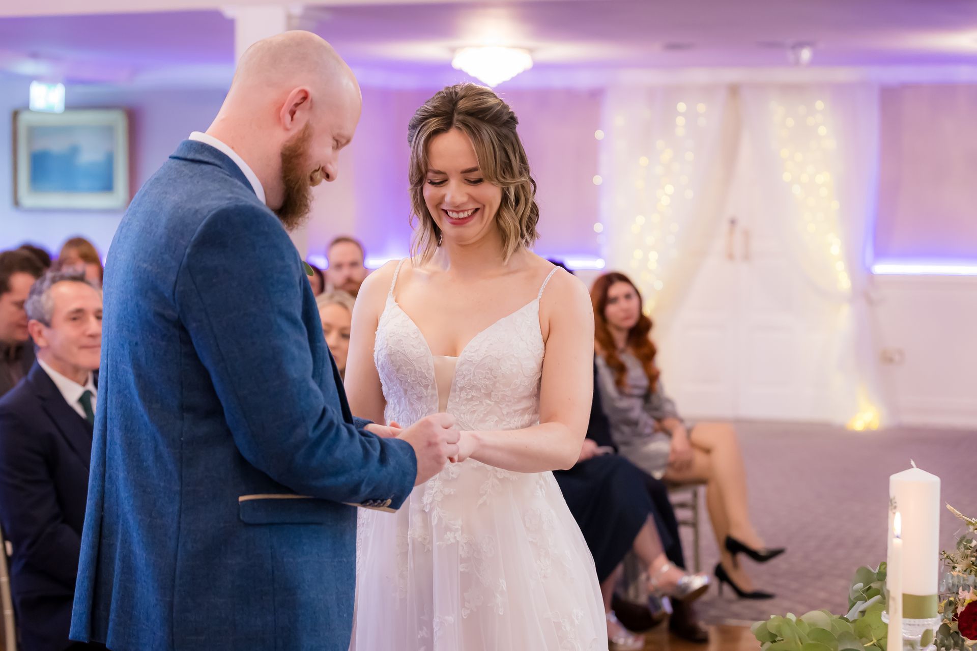 A year later the couple celebrated their wedding at the Castle Oaks Hotel, Castleconnell, in the presence of 100 guests. Their wedding party was composed of three bridesmaids, a best man, and two groomsmen. They walked up the aisle to “Jane” by Picture This, and had their first dance to “She Burns” by Foy Vance. For main course, guests were offered chicken supreme or Munster beef. Their unique personalised touch was to name the tables after different spiced rums because spiced rum is the couple’s favourite drink. In keeping with the theme, wedding favours consisted of a miniature bottle of rum for guests according to the rum their table was named after.